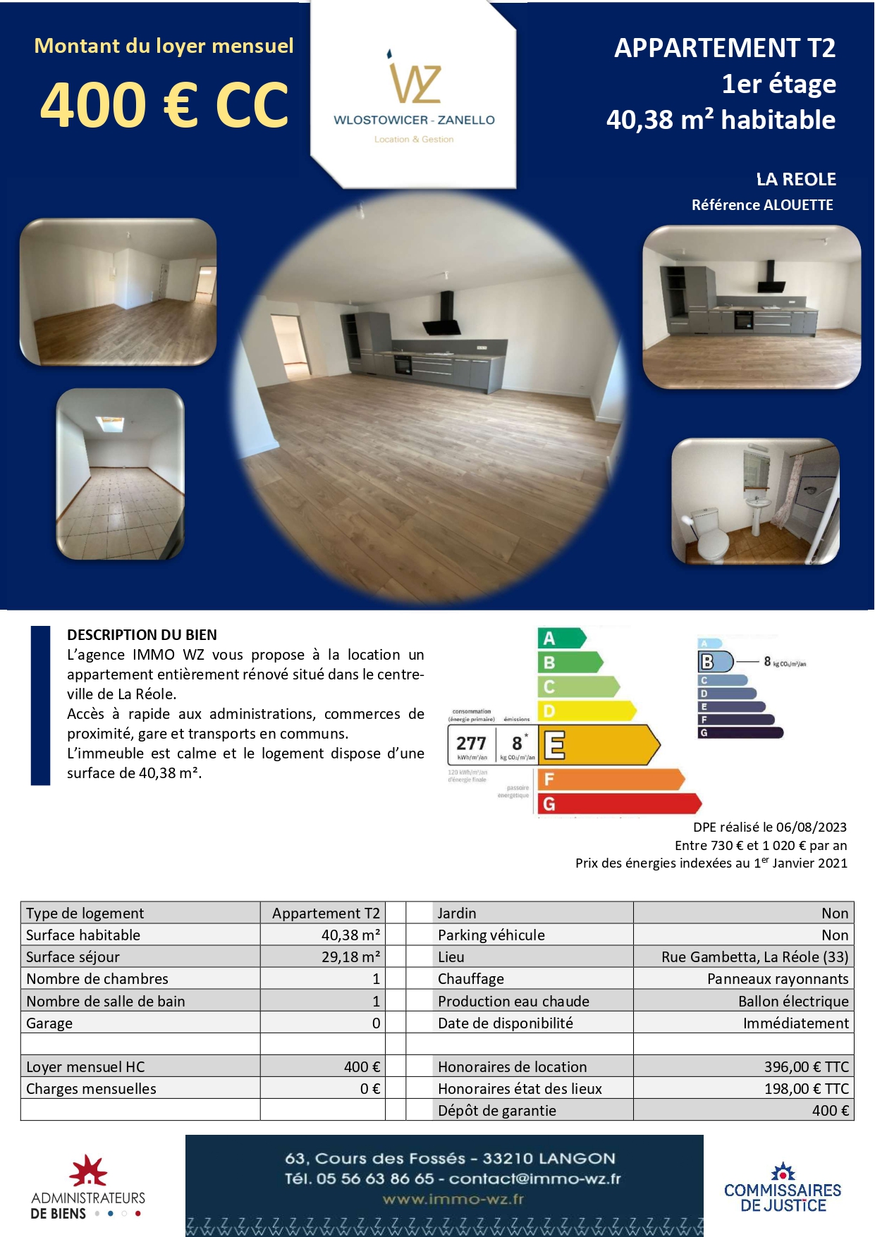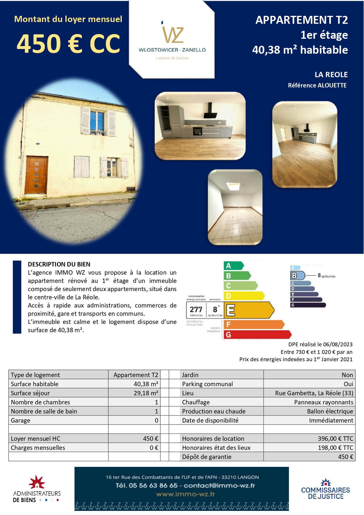 L’agence SAS IMMO WZ Wlostowicer-Zanello Location & Gestion de Langon vous propose à la location un appartement entièrement rénové, situé au premier étage d’un immeuble (composé de deux logements), dans le centre-ville de La Réole.