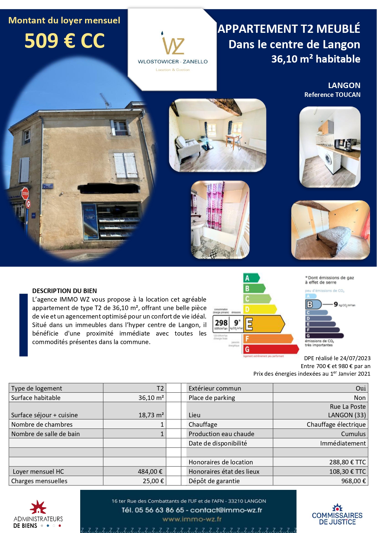 L’agence SAS IMMO WZ, Wlostowicer-Zanello Location & Gestion de Langon, vous propose à la location un appartement T2 situé au dernier étage d’un immeuble dans l’hypercentre de Langon.