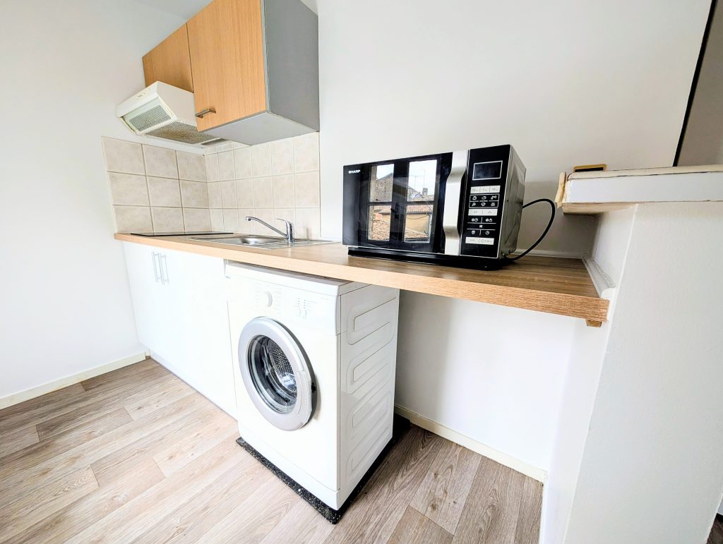 – Une cuisine ouverte meublée et équipée (hotte aspirante, réfrigérateur, plaque de cuisson, micro-ondes et machine à laver) ;