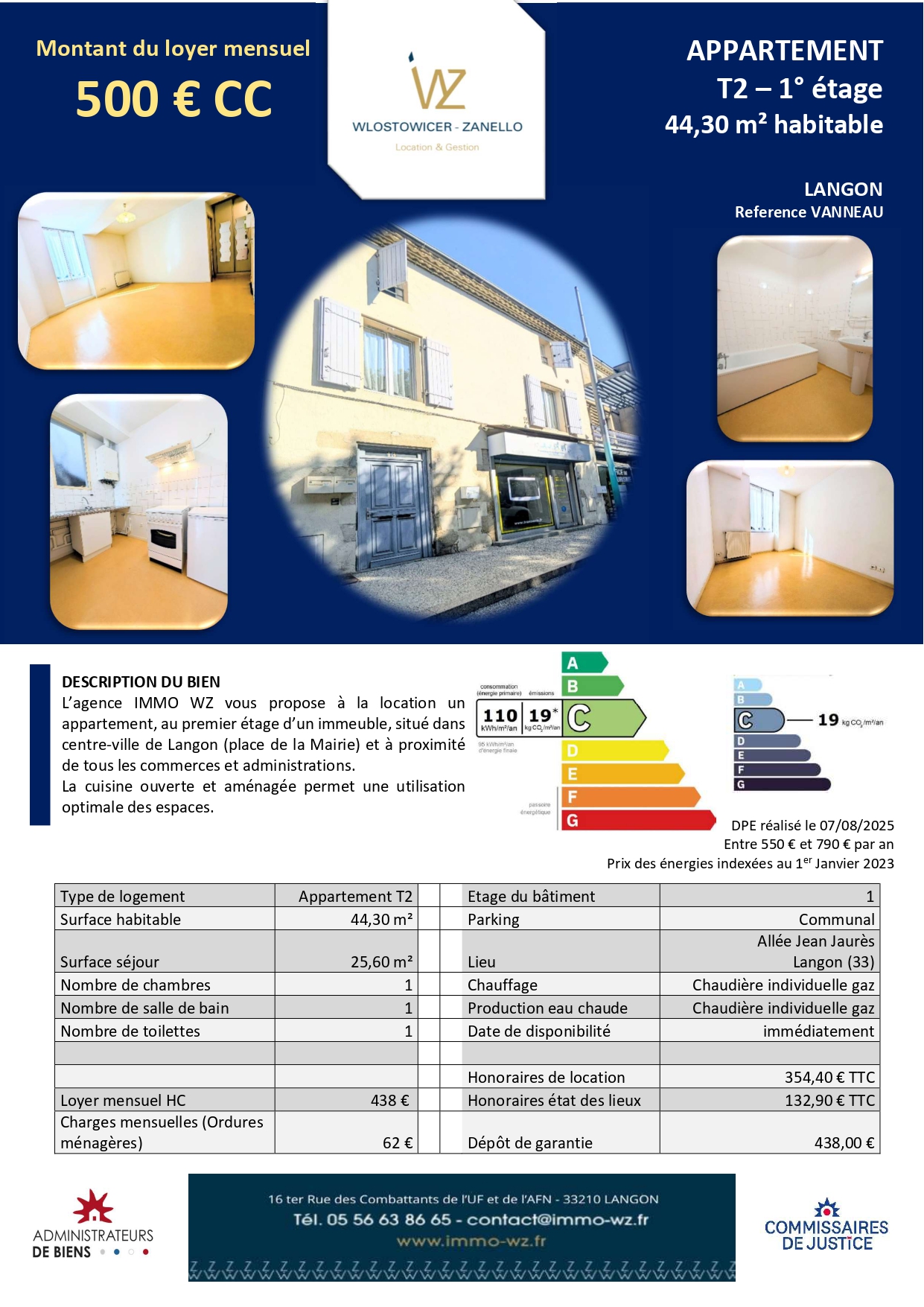 L’agence SAS IMMO WZ, Wlostowicer-Zanello Location & Gestion de Langon, vous propose à la location un appartement T2 situé au premier étage d’un immeuble.