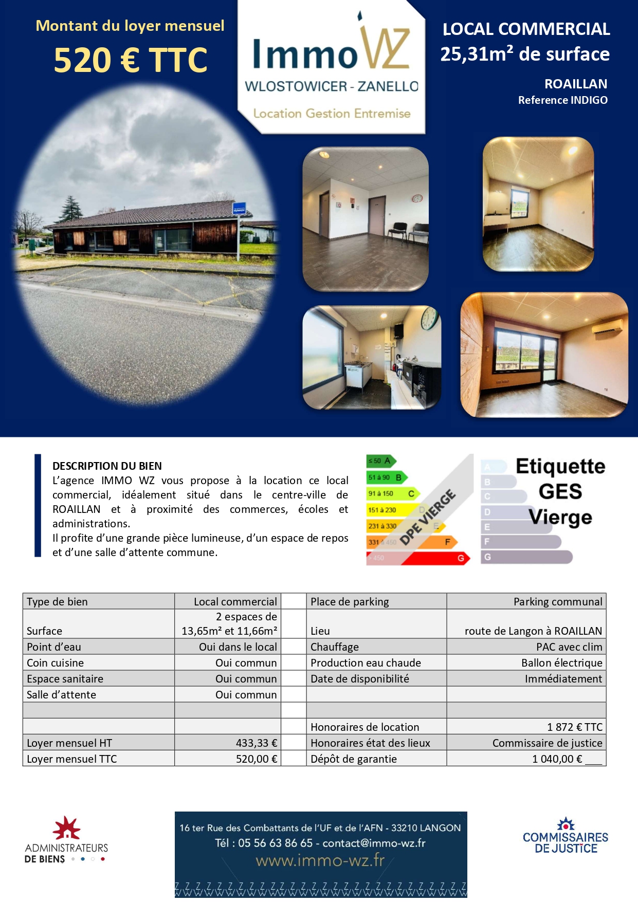 L’agence IMMO WZ SAS, Wlostowicer – Zanello, Location & Gestion de Langon, vous propose à la location un local commercial de plain-pied.