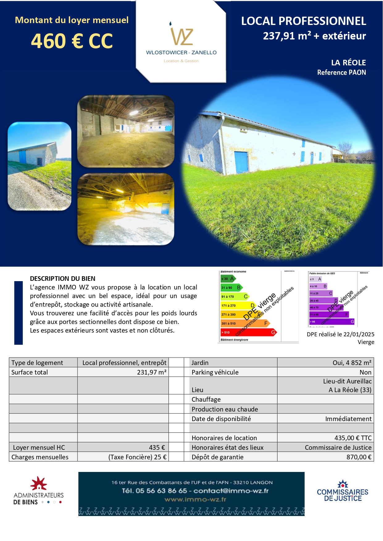 L’agence SAS IMMO WZ Wlostowicer-Zanello Location & Gestion de Langon vous propose à la location un local professionnel de plain-pied, avec un bel espace, idéal pour un usage d’entrepôt, stockage où une activité artisanale.