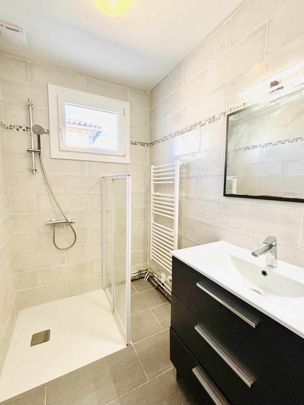 – Une salle d’eau avec une douche et une vasque sur meuble avec miroir ;
