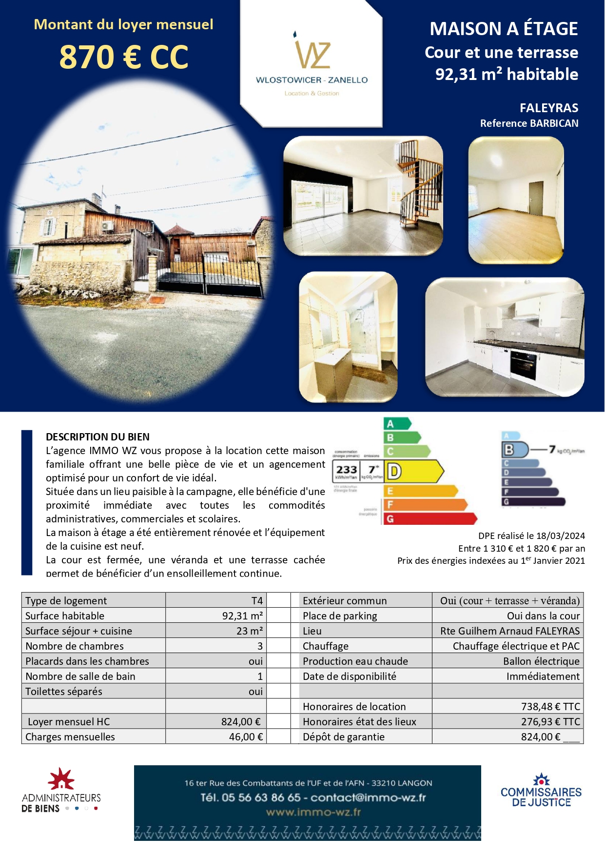 L’agence IMMO WZ SAS, Wlostowicer – Zanello, Location & Gestion de Langon, vous propose à la location une maison à étage rénovée située dans un environnement paisible.