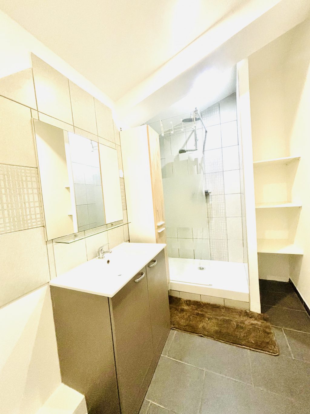 – Une salle d’eau avec une douche et une vasque sur meuble avec miroir ;